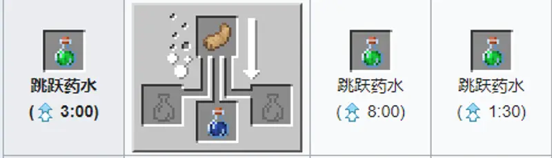 材料:兔子脚 粗制药水。药水效果:将生物的跳跃高度提升¼个方块。最多可提升到8分钟。