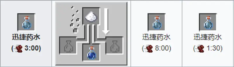 材料:糖 粗制药水。药水效果:为角色提升敏捷BUFF,提升大约20%的移动速度、疾跑速度与跳跃距离。添加莹石效果翻倍,可是时间降低到一分半。