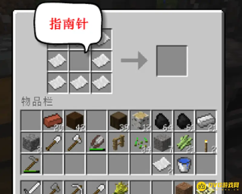 1.Minecraft中地图是通过指南针和纸合成,首先将红石和铁锭合成指南针。