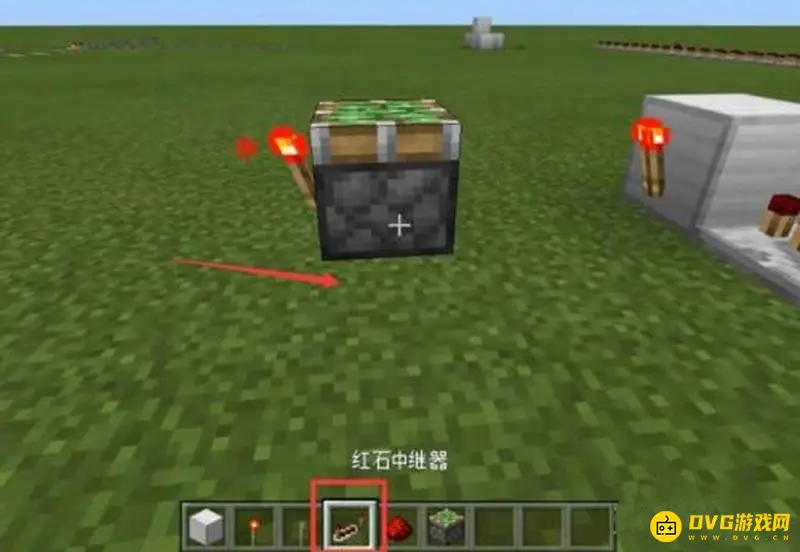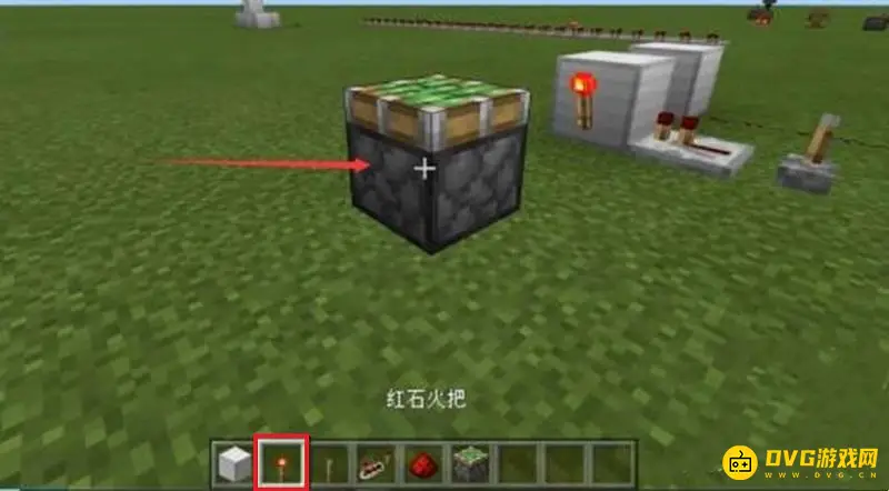 1.进入游戏,先把红石火把插在活性粘塞上。