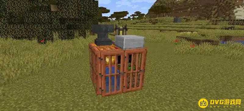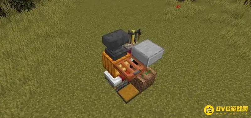 5、接着在耕地的上方第二格放上半砖用以封顶,在箱子露出来的上方第二格放上活板门。附魔台的上方放上酿造台,南瓜灯的上方放上铁砧。