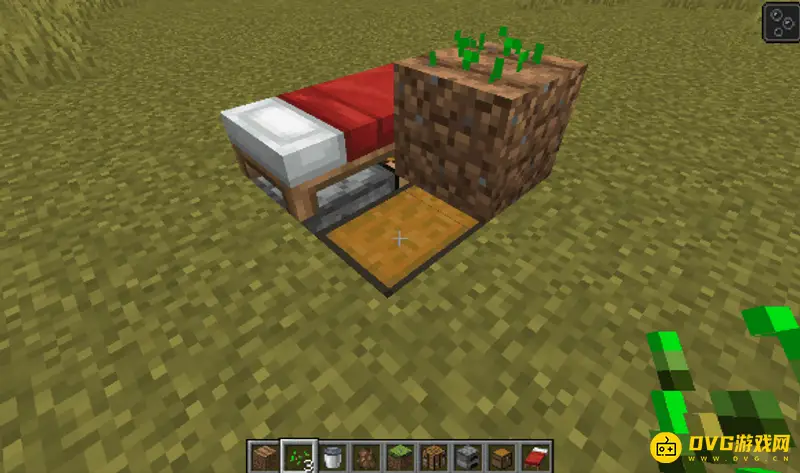 3、接下来在箱子上面放上一块泥土,泥土方块变成耕地方块后,不妨碍箱子开启。