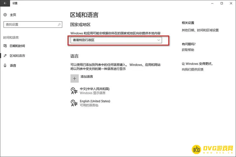 2.在接下来的过程中需要的是将“区域和语言”设置中的“国家和地区”更改为别的地区。