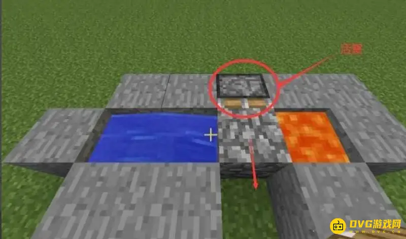 1.首先我们按照如图所示的方式放置方块,然后在两侧分别放入岩浆和水,这个原理就是用岩浆和水生成石头。