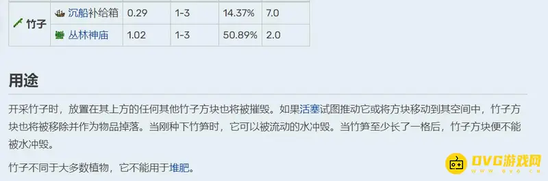 在我的世界里,竹子作为一种植物,它的作用有很多。比如开采竹子时,放置在其上方的任何其他竹子方块也将被摧毁;如果活塞试图推动它或将方块移动到其空间中,竹子方块也将被移除并作为物品掉落;当刚种下竹笋时,它可以被流动的水冲毁;当竹笋至少长了一格后,竹子方块便不能被水冲毁;竹子不同于大多数植物,它不能用于堆肥。