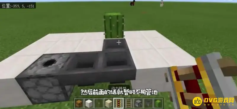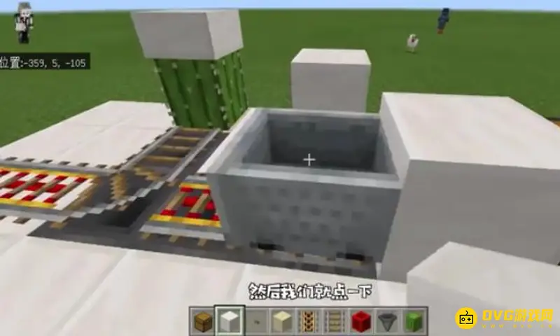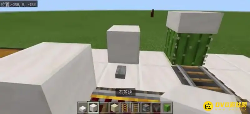 5.然后在仙人掌上饭上半个方块,在轨道旁边放上按钮,按钮旁边也放一个方块。