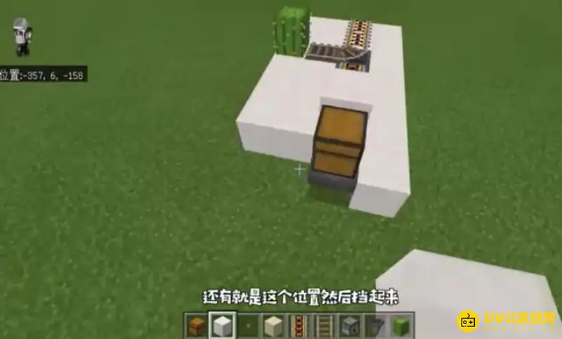 4.在那两个漏斗上,前面一个放上白色方块,后面一个放上宝箱。