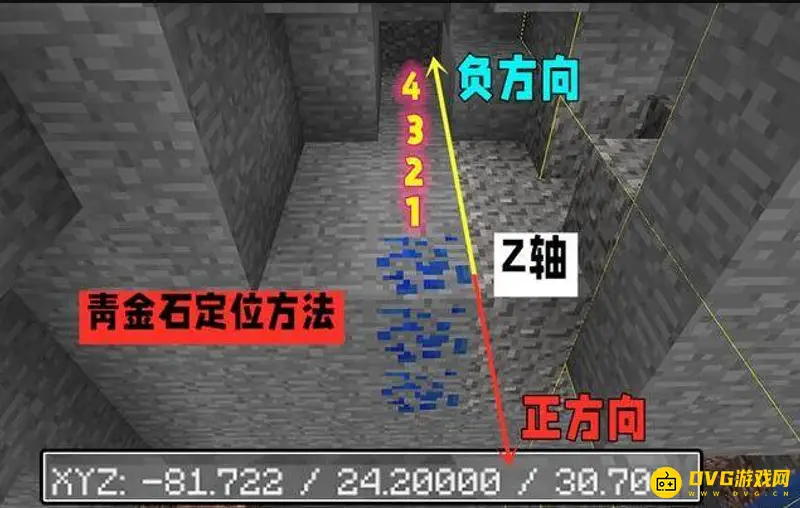 青金石定位法指的是找到青金石后,沿着Z坐标负方向减去四格,然后垂直向下挖,就能找到钻石矿。具体操作如下: