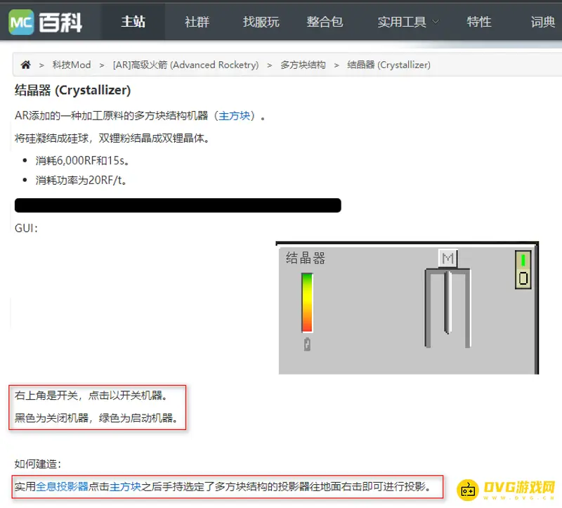 结晶器的右上角是开关,点击以开关机器。黑色为关闭机器,绿色为启动机器。实用全息投影器点击主方块之后手持选定了多方块结构的投影器往地面右击即可进行投影。