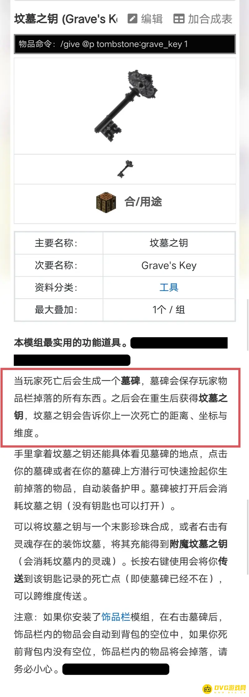 有的,有墓碑还有坟墓之匙。当玩家死亡后会生成一个墓碑,墓碑会保存玩家物品栏掉落的所有东西。之后会在重生后获得坟墓之钥,坟墓之钥会告诉你上一次死亡的距离、坐标与维度。