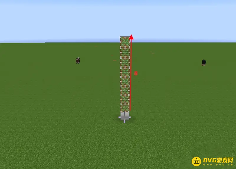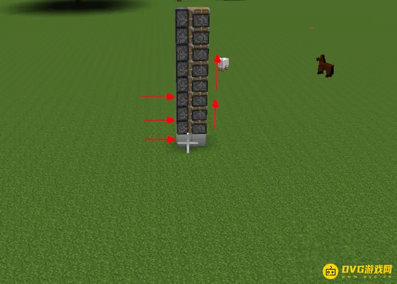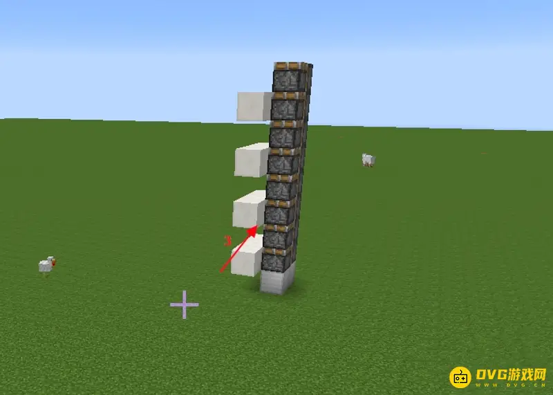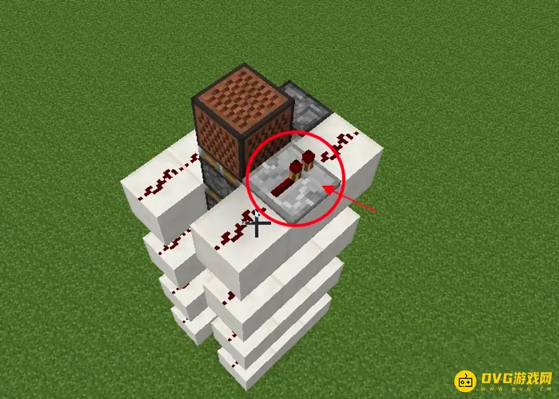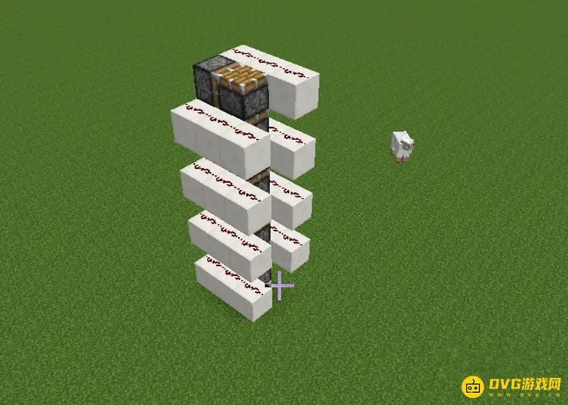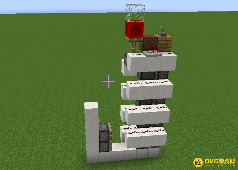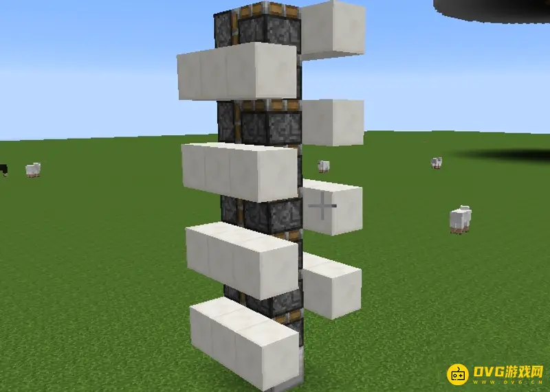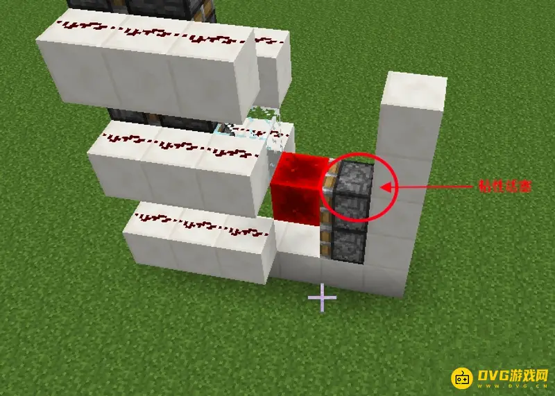 8、然后在最底层向一侧扩三格,放两个粘性活塞,最上面的粘性活塞放一个红石块。