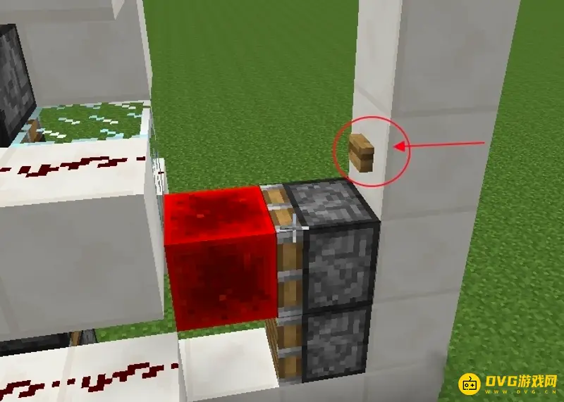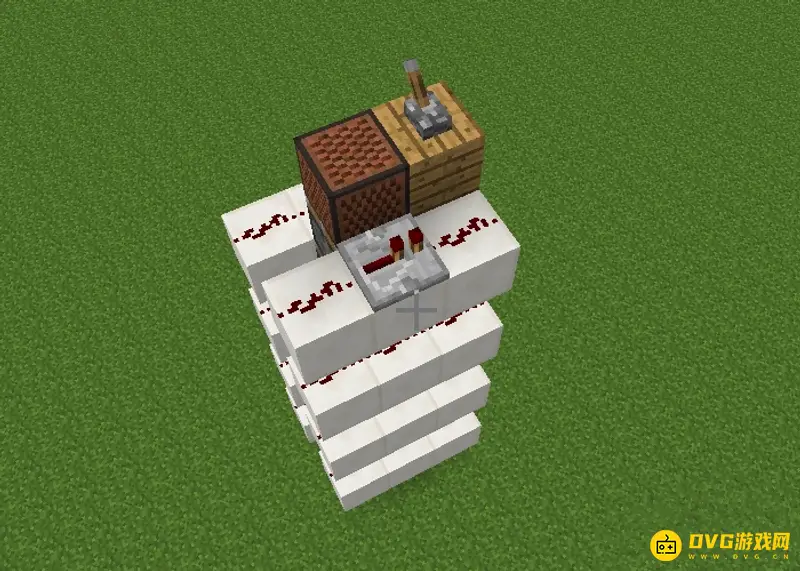 7、在音符盒后面放一个实体方块,上面放一个拉杆。拉杆的作用是为了收回活塞的。