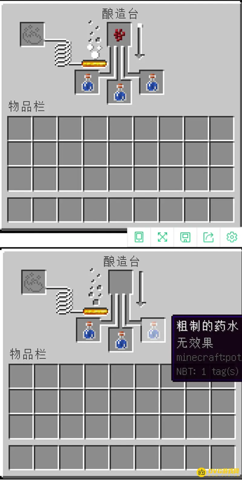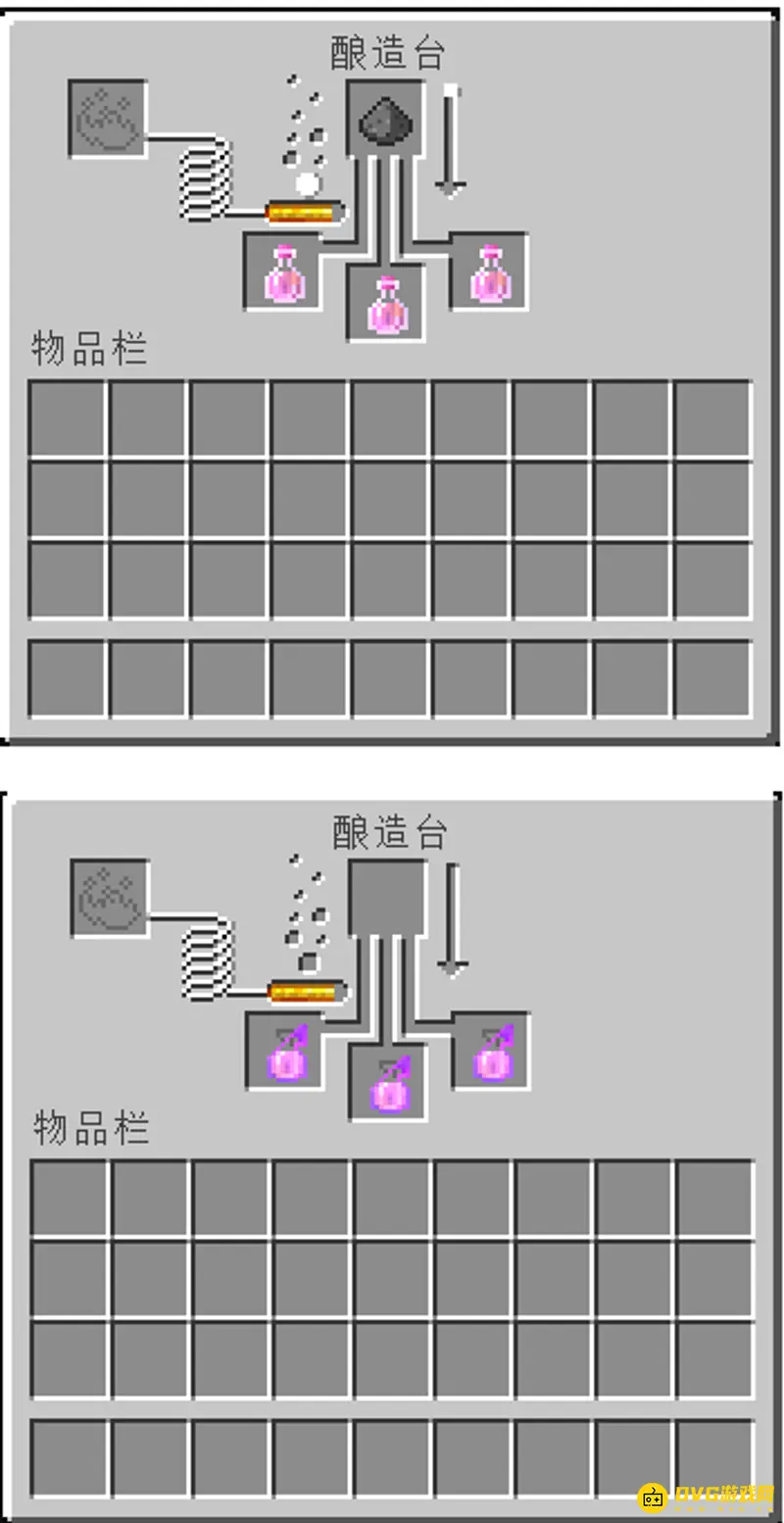 2、往酿造台里放入烈焰粉,放入地狱庞,合成出“粗制的药水”。