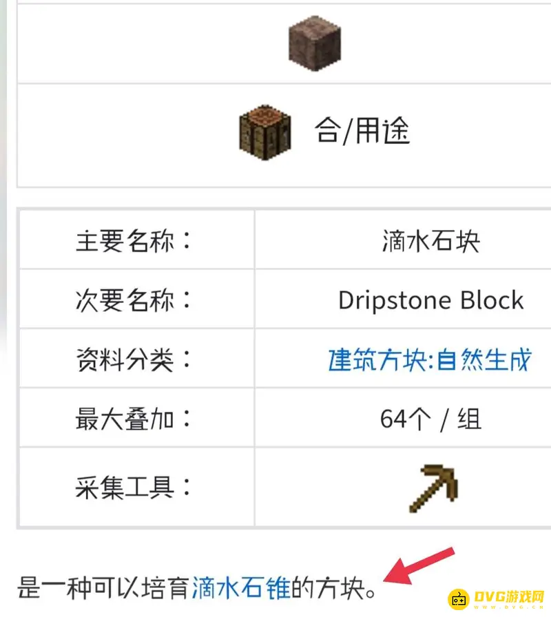 在我的世界这款游戏中,滴水石块可用于培育滴水石锥。滴水石块可以用任意种类的镐挖掘,若不用镐挖掘,将不会掉落任何物品。