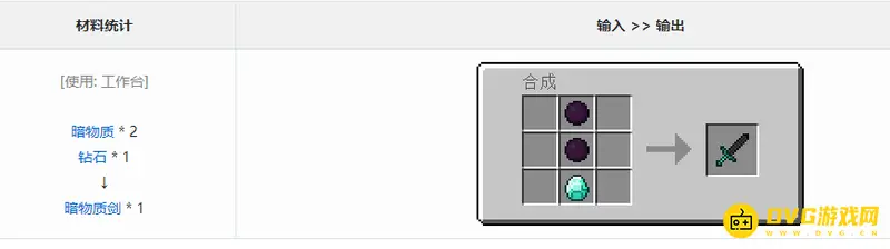 暗物质2个和一个钻石通过工作台合成,暗物质剑是暗物质打造的无限耐久剑。默认C键造成敌对生物造成范围伤害,只有在攻击冷却完全恢复时才能发动。造成12点的穿甲伤害。不会受充能等级影响