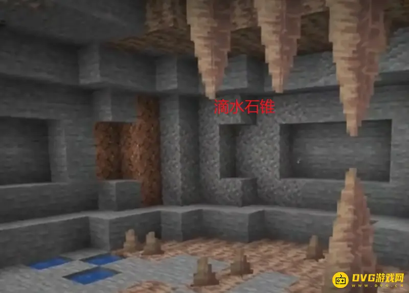 滴水石锥有钟乳石、石笋和石柱三种形态。自然生成于溶洞生物群系。滴水石锥可以含水,只能被放置在一个完整方块的上表面、下表面或其他滴水石锥上。