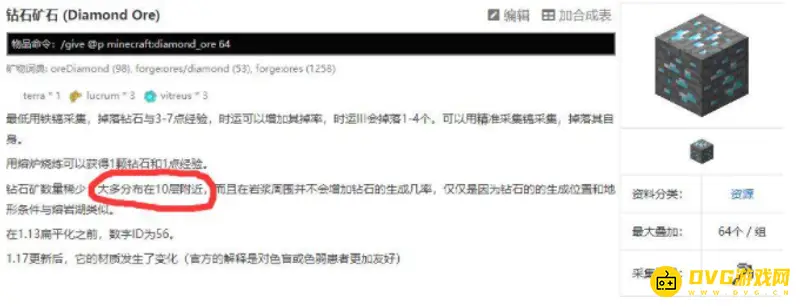 钻石在10层附近。钻石是从钻石矿石或战利品箱子中获得的一种稀有矿石,可用于合成最高级的工具和盔甲,以及附魔台。有两种方法能找到它们,洞穴探险或采矿。