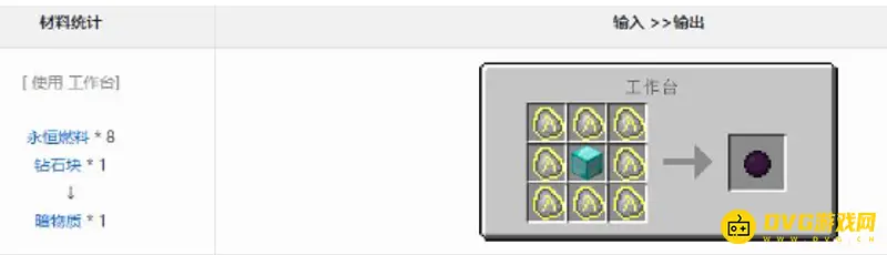 二、合成暗物质要8个永恒燃料和1块钻石块合成,将永恒燃料放到四周,再把钻石块放到中间,就可以合成出暗物质了,如下图所示。
