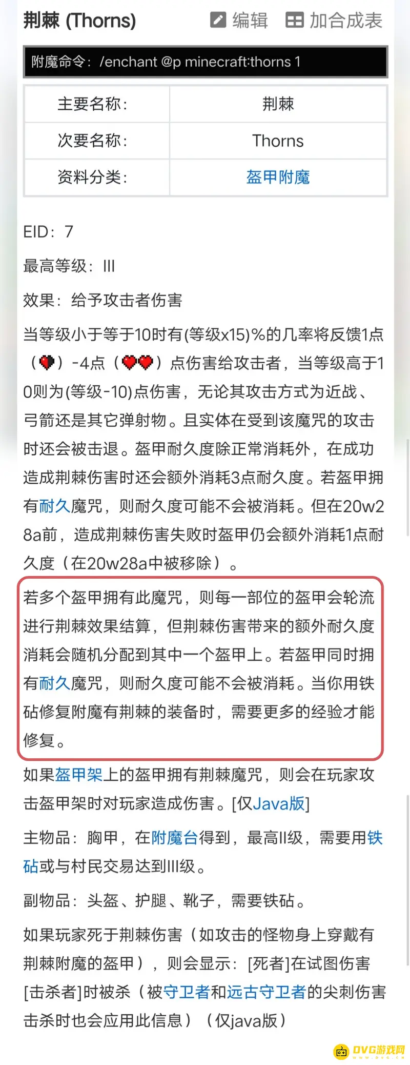 荆棘不可以叠加,是唯一被动,不可叠加。若多个盔甲拥有此魔咒,则每一部位的盔甲会轮流进行荆棘效果结算,但荆棘伤害带来的额外耐久度消耗会随机分配到其中一个盔甲上,不可叠加。