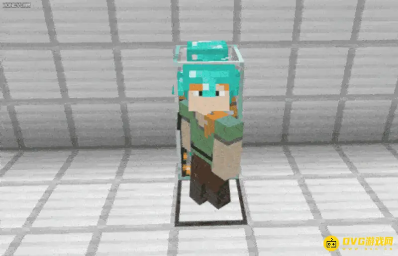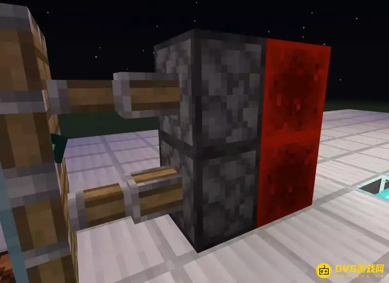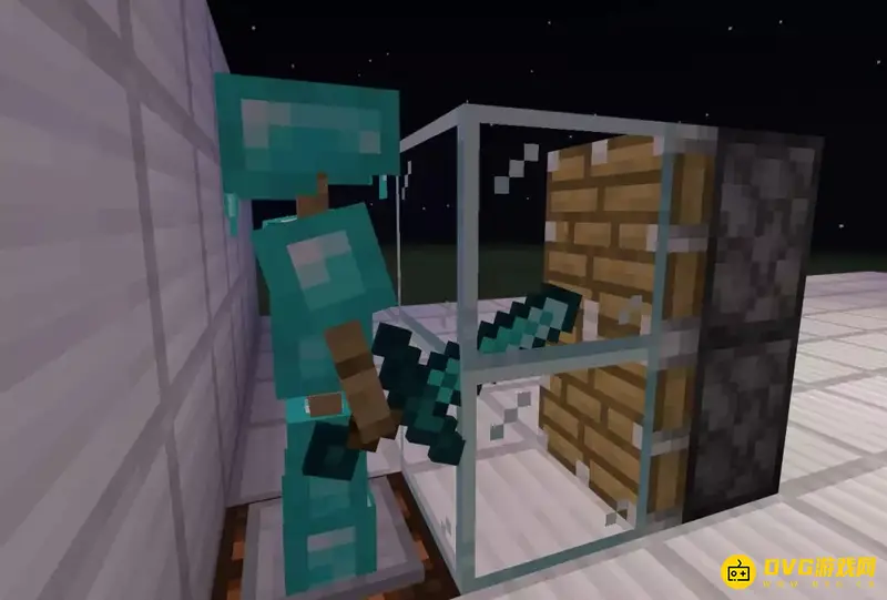 4、在盔甲架前方放置两块玻璃,再在玻璃后放置两个活塞,用红石块激活活塞。