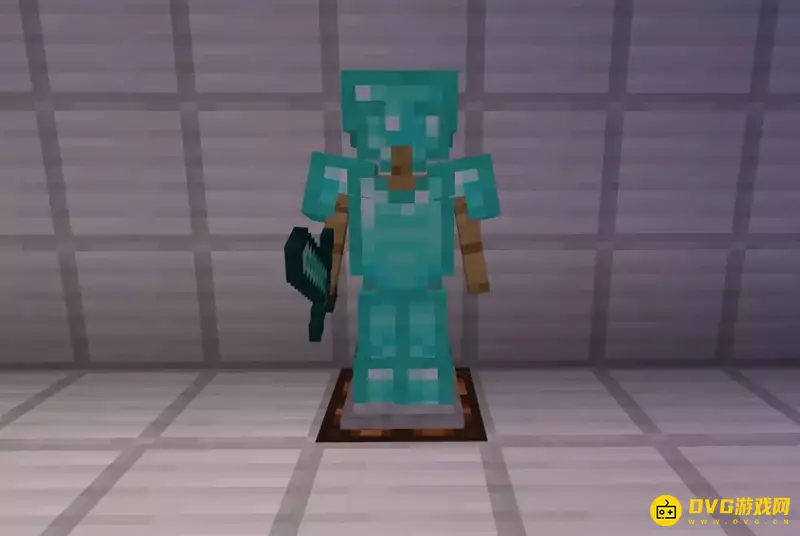 5、在展示柜前一格挖一格深放置一个发射器,发射口朝上,并在发射器内放入防具,放置压力板,踩踏压力板换上防具,钢铁侠做好了。