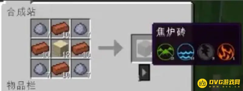 2.焦炉是使用焦炉砖进行搭建的,焦炉砖是使用4个黏土、4个红砖、1个沙子合成的,沙子放中间,红砖放上下左右,黏土放四角。
