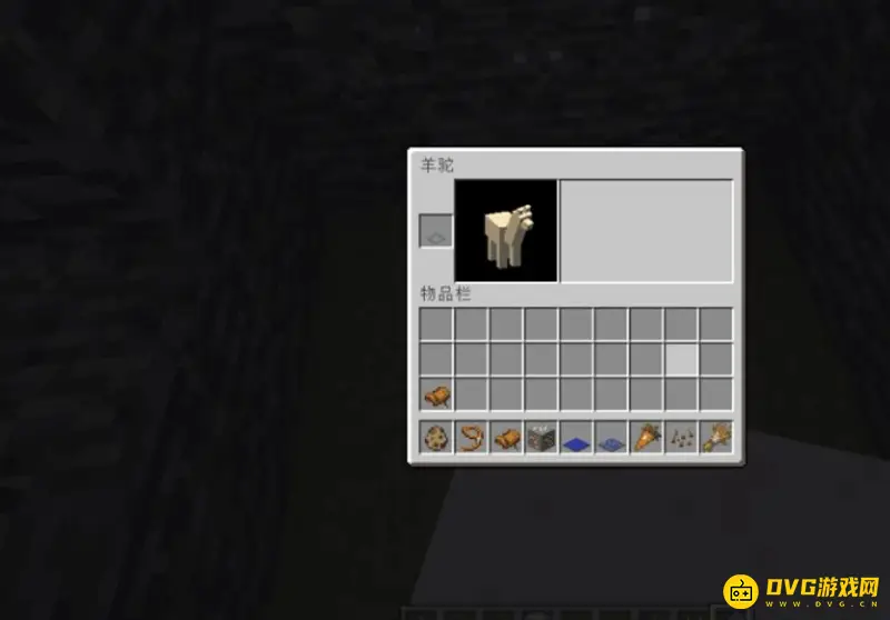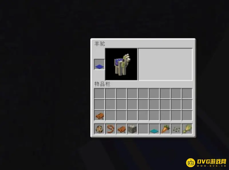 6.我们可以看到羊驼的面板里有一个物品框可以放东西,但是鞍不可以放进去,我们只能放进去各种颜色的毛毯。