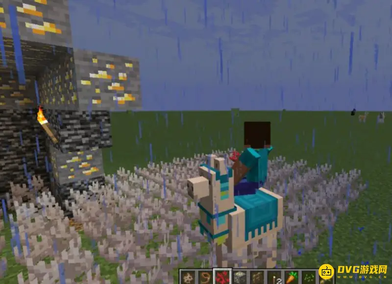 2.生成羊驼,然后驯服羊驼,我们先直接骑上去。鼠标右键骑羊驼。