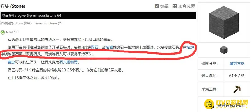 2,然后找到石头的说明,就会发现在熔炉里烧炼圆石可以获得石头。