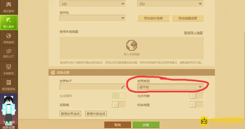 1,首先我们进入创建游戏界面,选择地形为超平坦。
