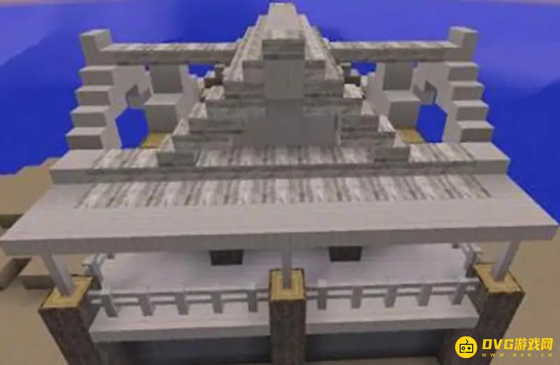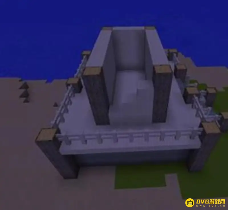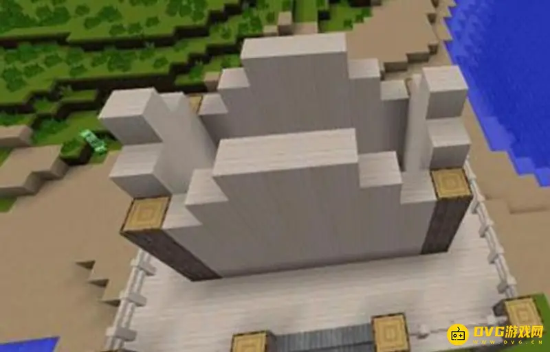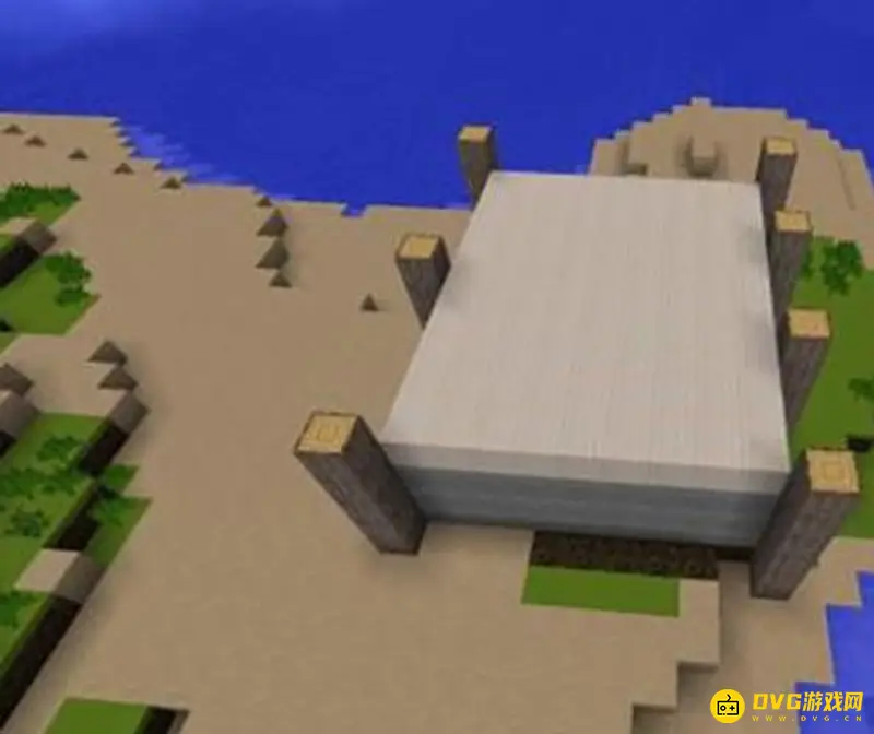 2、将搭建好的地基框架用桦木封顶,然后用原木分别在四个角搭建高度为4的原木柱,然后在长边3格和7格的位置安放两个高4格的原木柱,之后在对面长边6格处安放一个高四格的原木柱子。