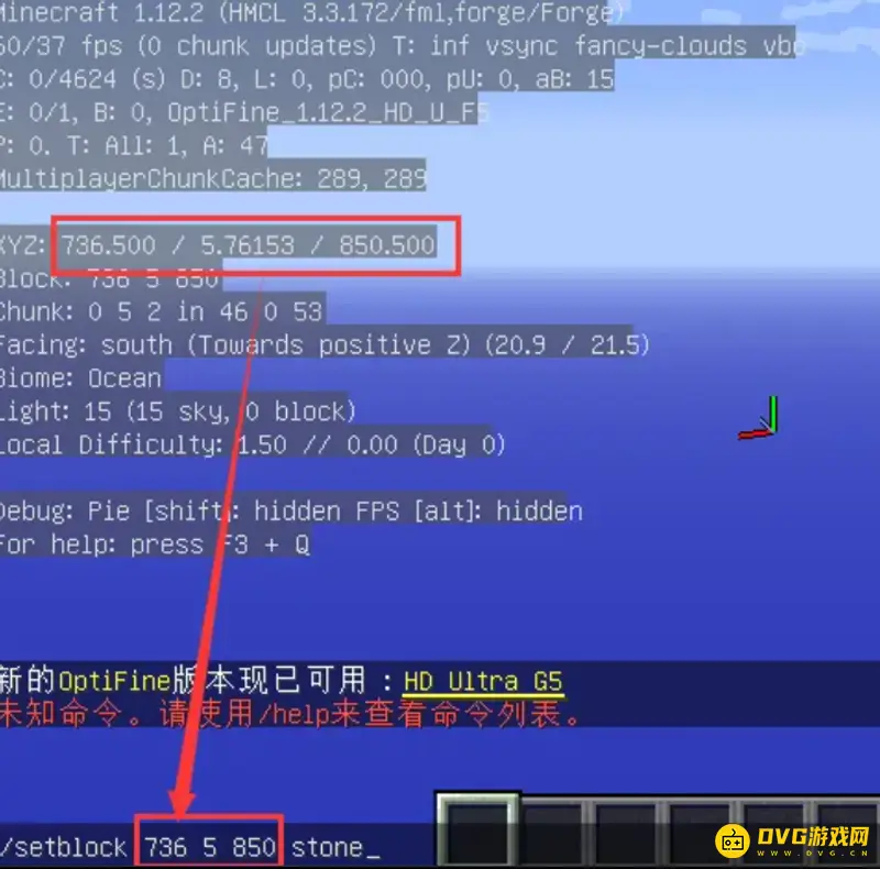 5.最后按下F3,查询坐标,并输入相应指令放下第一个方块,就可以开始空岛之旅了。