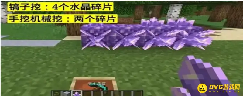 3.使用手或者其它工具挖紫水晶方块簇能获得两个紫水晶碎片,使用镐(并且不带精准采集魔咒)挖掘紫水晶簇能获得4个紫水晶碎片。镐带有时运l魔咒时掉落8个紫水晶碎片的几率为1%,时运lI掉落8个或者12个紫水晶碎片的几率为25%。
