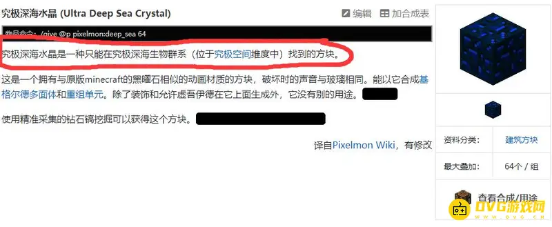 首先我们搜索并进入我的世界究极深海水晶的相关说明,然后就可以在界面上方发现究极深海水晶只能在究极深海生物群系(位于究极空间维度中)找到。