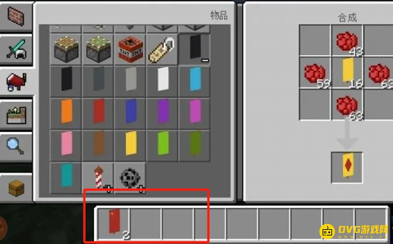 1、制作五星红旗首先需要准备:红色旗帜、砖块、工作台、蒲公英黄染料和玫瑰红染料。