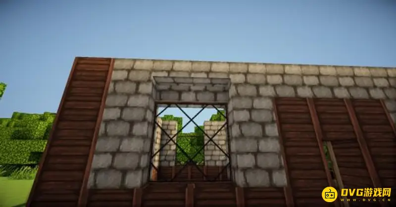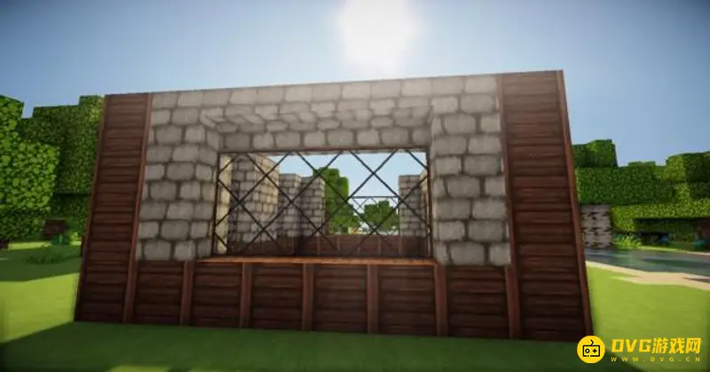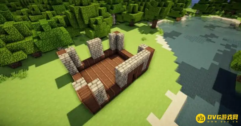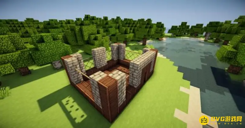 5、在四个柱子的两边放上石砖,门框上的也连起来(可以替换成圆石,我比较喜欢石砖而已)。