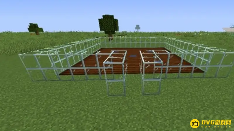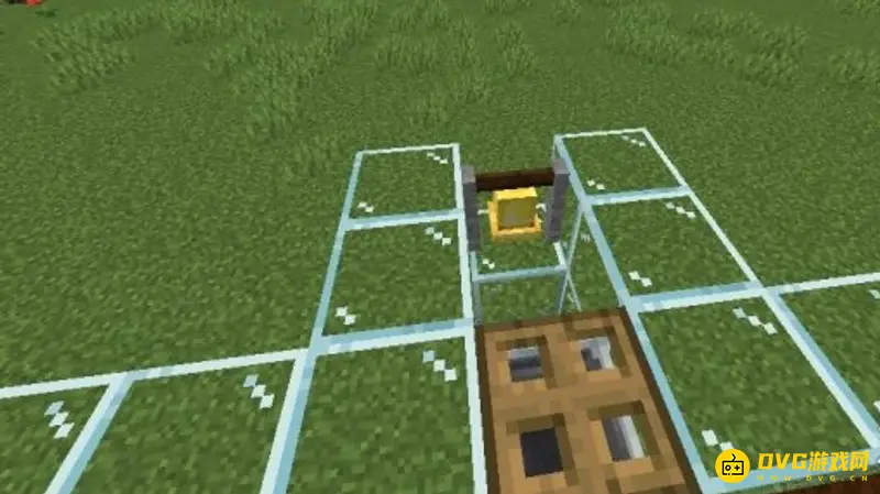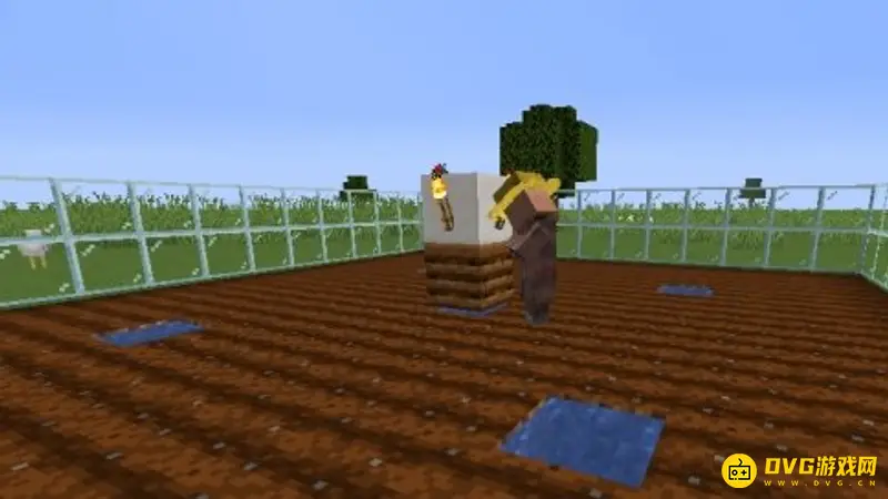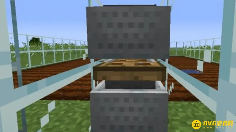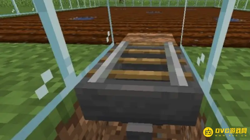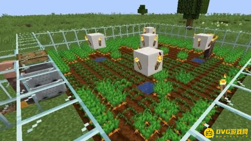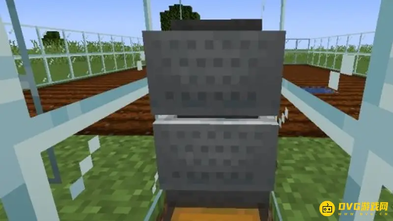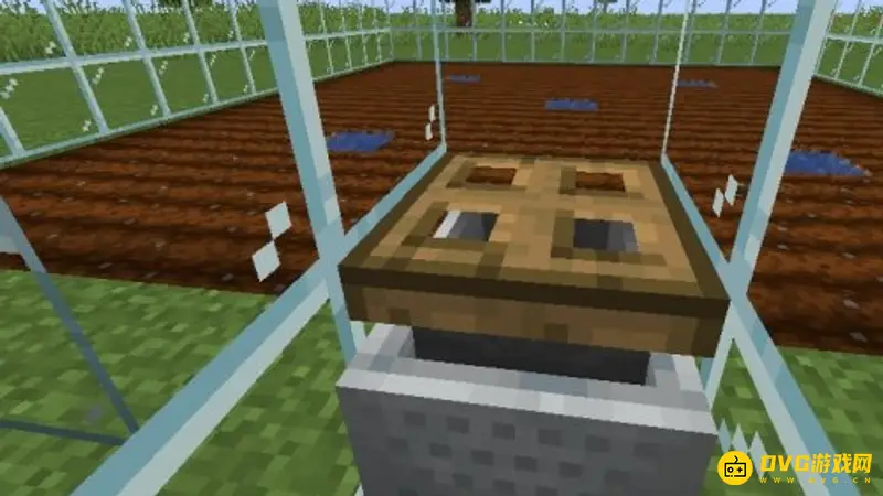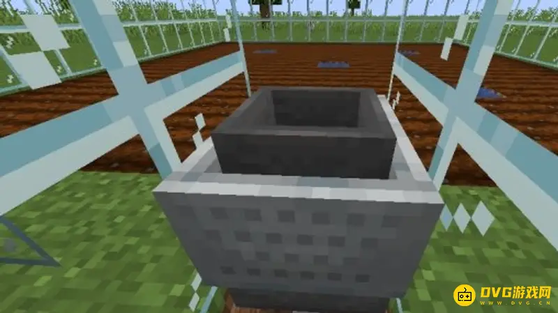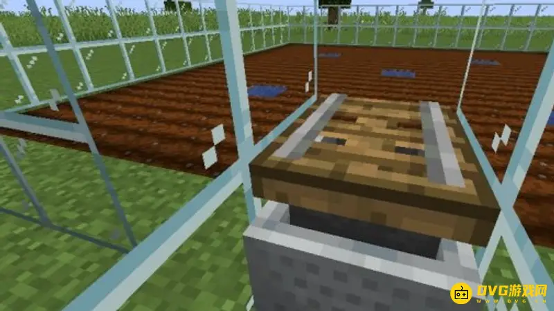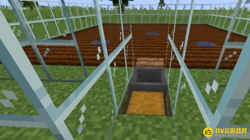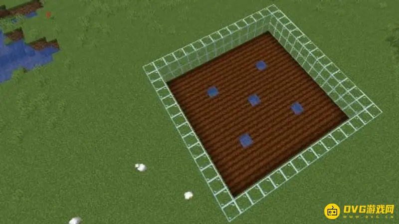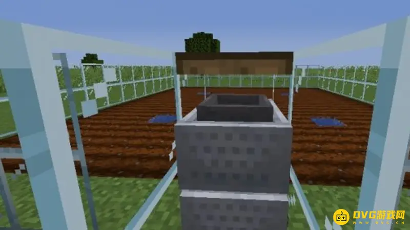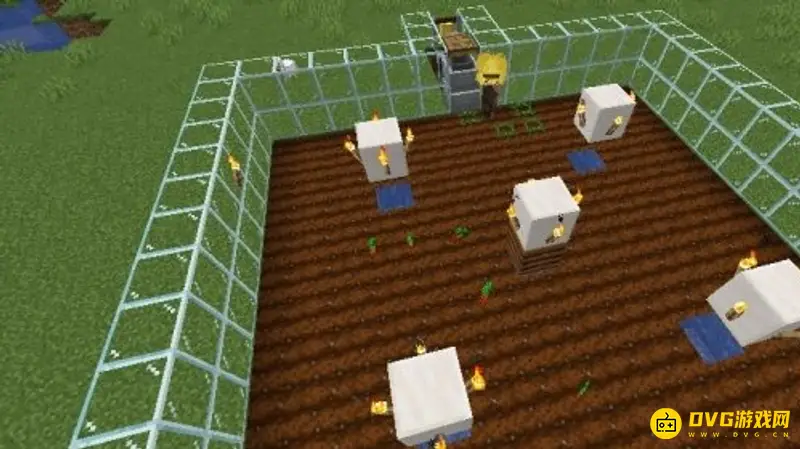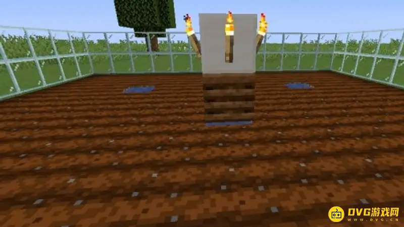 如图,用任意方块围绕耕地搭建2格高的围墙(为了使教程更直观,本教程中使用玻璃)。