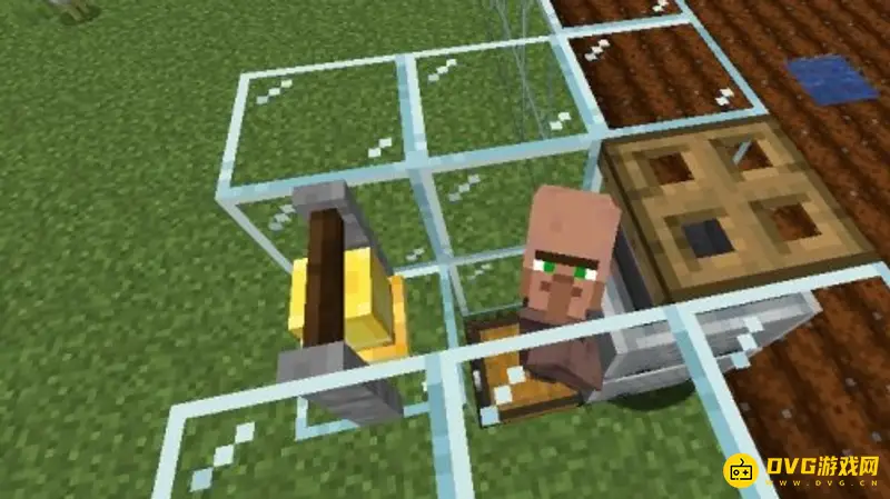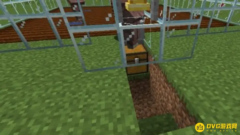 如图,在最上面的漏斗矿车上方放置1个任意材质的活板门(注意活板门的位置)。 活板门的作用:防止箱子上的村民跑进耕地。