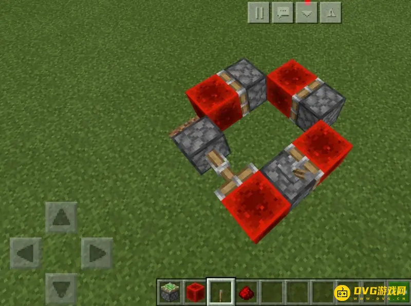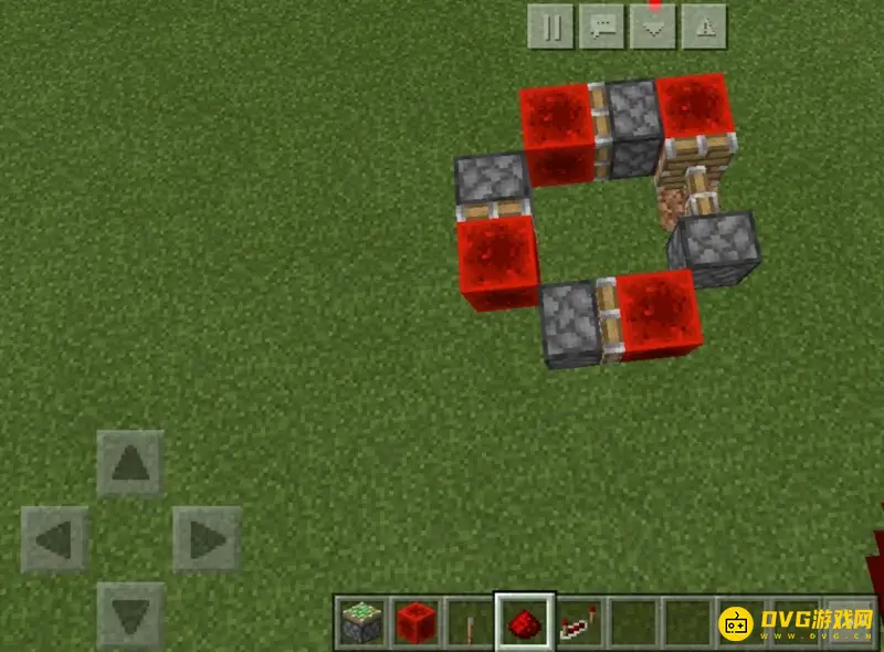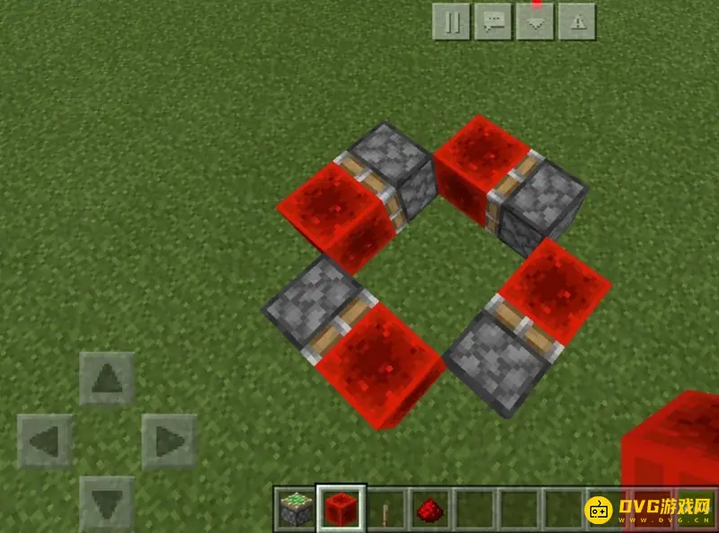 2、方法二:首先将红石块和黏性活塞如下图环装摆放,然后再在其中一个黏性活塞上放上一个拉杆,将拉杆迅速打开再关闭,就完成了。