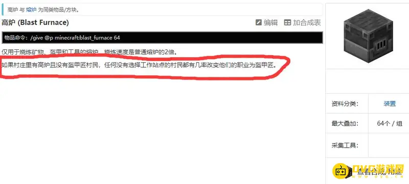 2,然后找到高炉的说明,就会发现高炉会使村民变成盔甲商,所以工作方块是高炉。