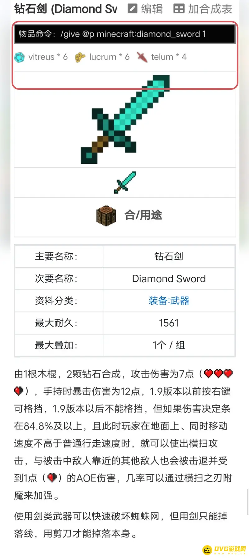 物品命令:/give @p minecraft:diamond_sword 1。钻石剑是Minecraft中的一种近战武器,伤害值较高。是游戏后期的武器。钻石剑也是清理蜘蛛网的有效工具。