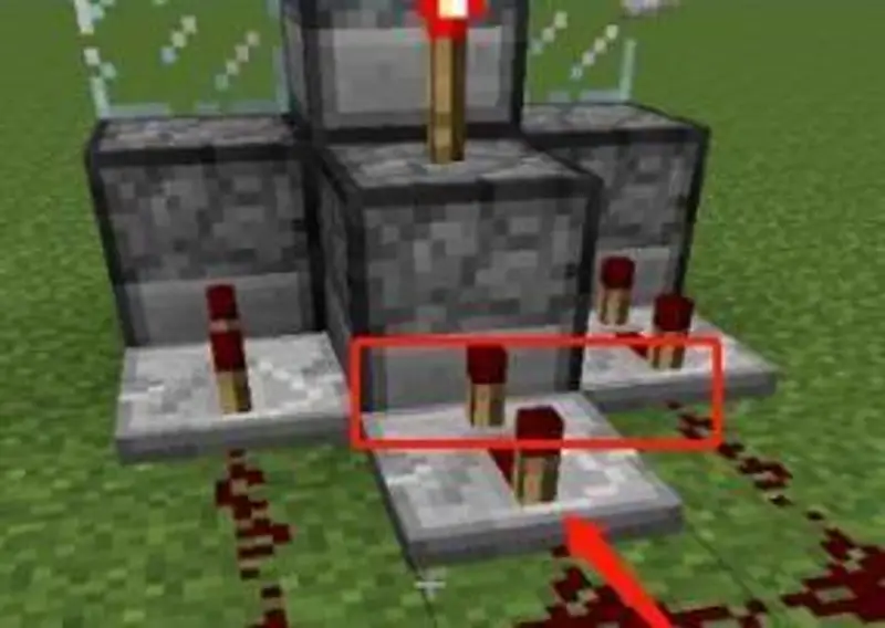 2、接下来我们把发射器摆放好,再在中间那个发射器上放一个红石火把当做触发器,火把面前放多一个发射器。