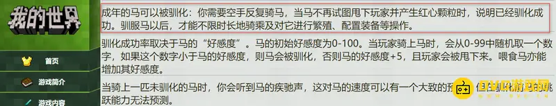 游戏中的坐骑指的是马,成年的马可以被驯化,需要空手反复骑马,当马不再试图甩下玩家并产生红心颗粒时,说明已经驯化成功。驯服马以后,才能不限时长地骑乘及对它进行繁殖、配置装备等操作。