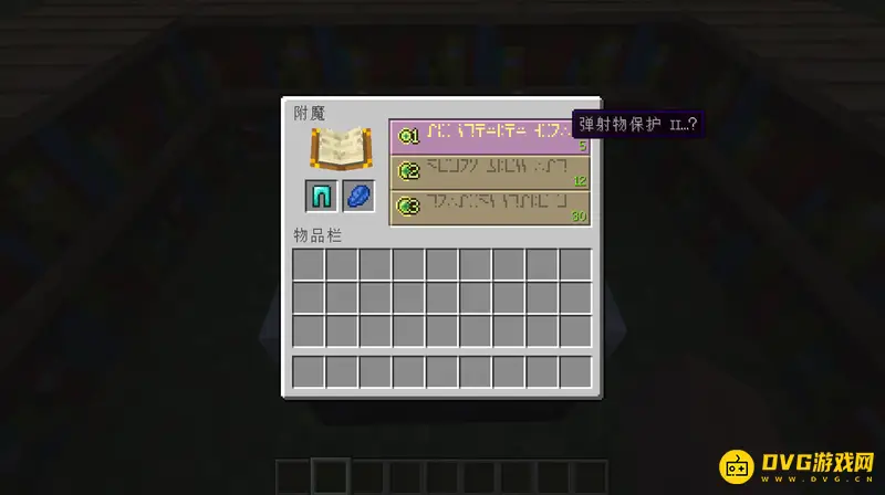 1、进入游戏中,玩家打开附魔台,将护腿和青金石放入框中,可以看到一级附魔为弹射物保护。