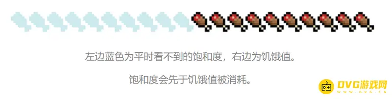 饱和度和饥饿值类似,也是一种重要的食物统计方式,但它是不会被显示出来的,当降临在出生点时,饥饿值是满的,饱和度此时也是满的,进行一段时间的活动后,饱和度消耗完,饥饿值才会开始消耗。