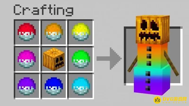3、彩色雪傀儡。雪傀儡在游戏中可以合成,不过并不是通过合成表,而是摆放合成。在老玩家的手中,雪傀儡也加入到合成表的行列。合成后的效果比较浮夸,用南瓜头以及各种各样的彩色雪球来合成一个彩色的雪傀儡