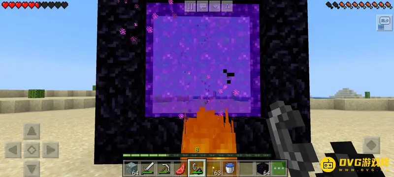 13、摆好之后用打火石在下面中间点一下,就会发现门中间就有紫色的方块了,地狱传送门就做好了。