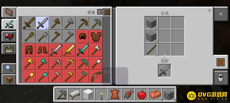 2、完成以后就代表你进入木头的时代了,之后就是找石头了,在找石头的路上看到羊可以打了,羊身上会掉下羊毛,3个羊毛可以用工作台做床,这个晚上有大用处,石头找到之后,和上面木头一样的方法使用工作台制作石剑、石斧头等等,还可以做熔炉。