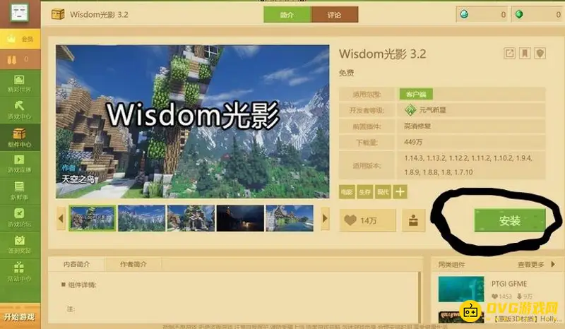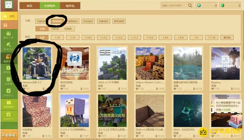 1:在电脑上打开我的世界然后进入我的世界组件中心,点击上方的视觉组件,然后在下方选择一个光影进入。