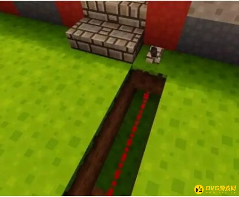 6、在刚刚挖出的这个小空间如下图放上一个粘性活塞 红石块的组合。在活塞周边放上红石线。